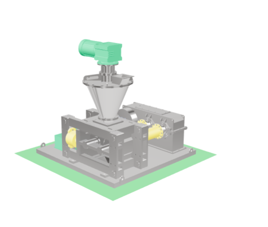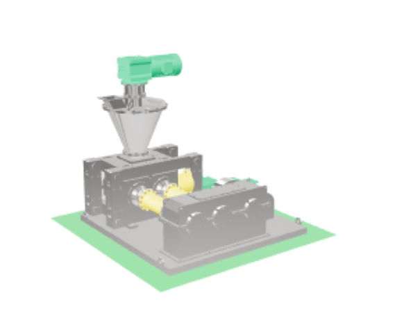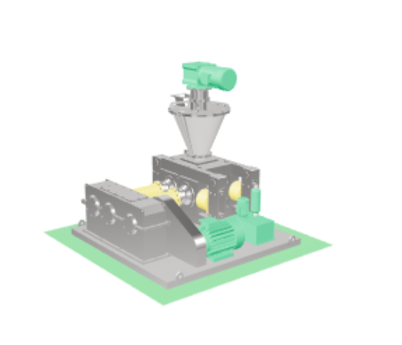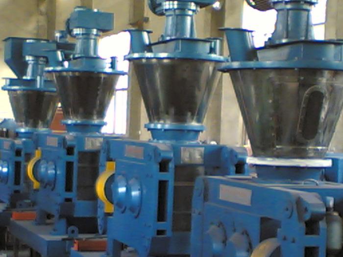 各種干粉物料從設備頂部加入,經(jīng)脫氣、螺旋預壓進入兩個平等軋輥,軋輥相對旋轉,物料被強制送入兩輥之間,軋輥將物料咬入輥隙進行壓縮,物料通過壓縮區(qū)后,物料的表面力和 重力使之自然脫出。脫出后的指條狀團塊進入碎粒機由旋轉刀排破碎,被破碎的物料進入整粒 機通過滾動刀排使顆粒和部分粉狀物料進入旋振篩進行篩分。合格品通過輸送機被送入成品倉。粉狀篩下物料通過輸送機再次被送回原料倉進行二次輥壓,擠壓力的大小不一可根據(jù)造粒操作的需要由液壓油缸的壓力進行調節(jié)。