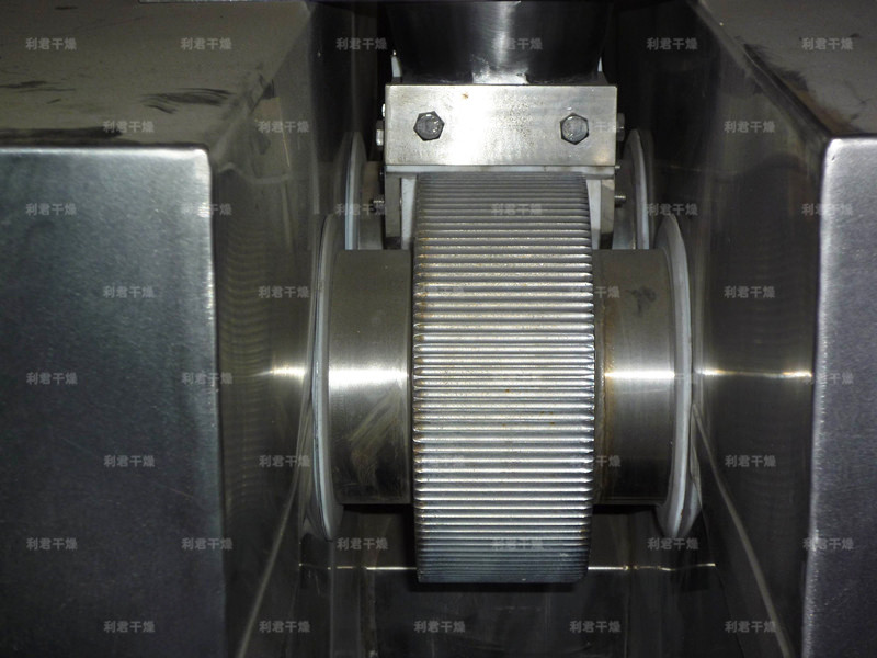 干法輥壓造粒主要是靠外部加壓方式,使物料強制通過兩個反而旋轉的輥輪間隙,壓縮成片。在輥壓過程中,物料的實際密度能增大1.5-3倍,從而達到一定的強度要求。