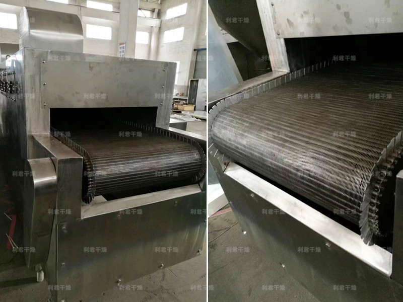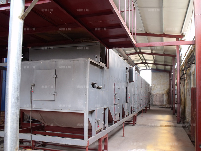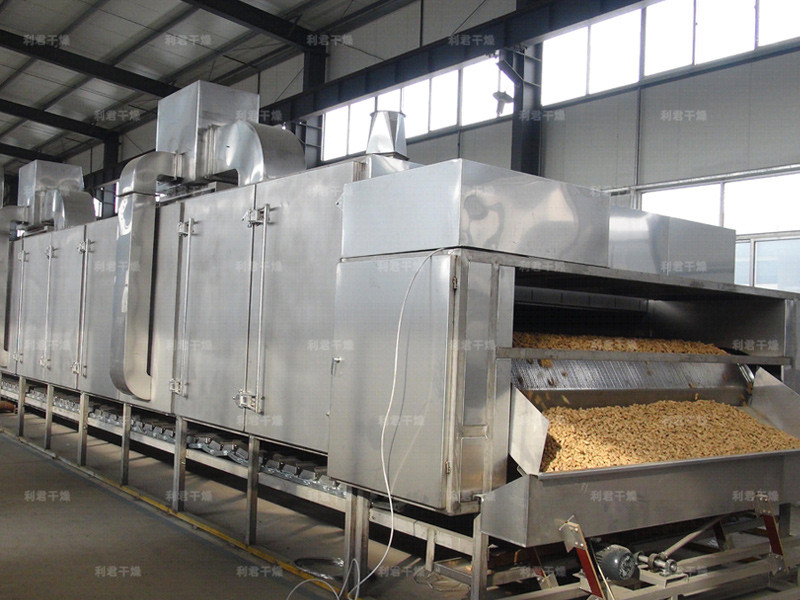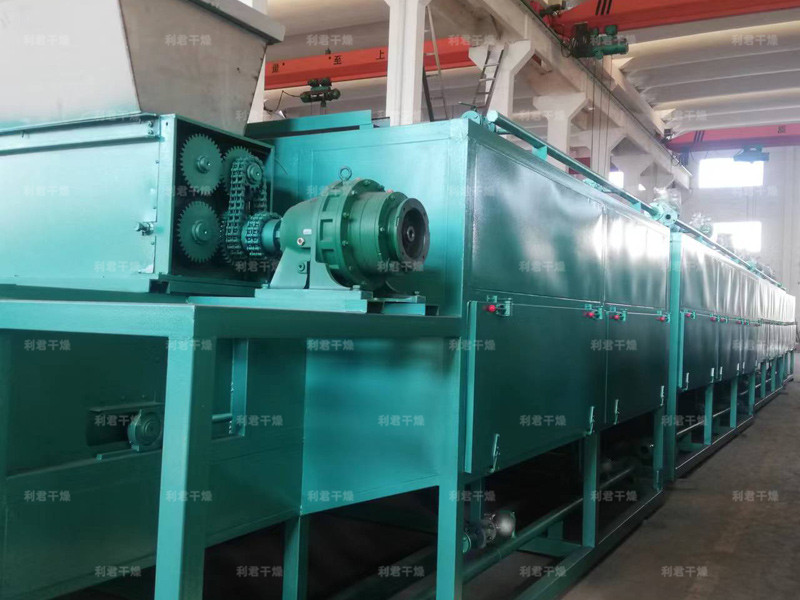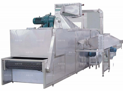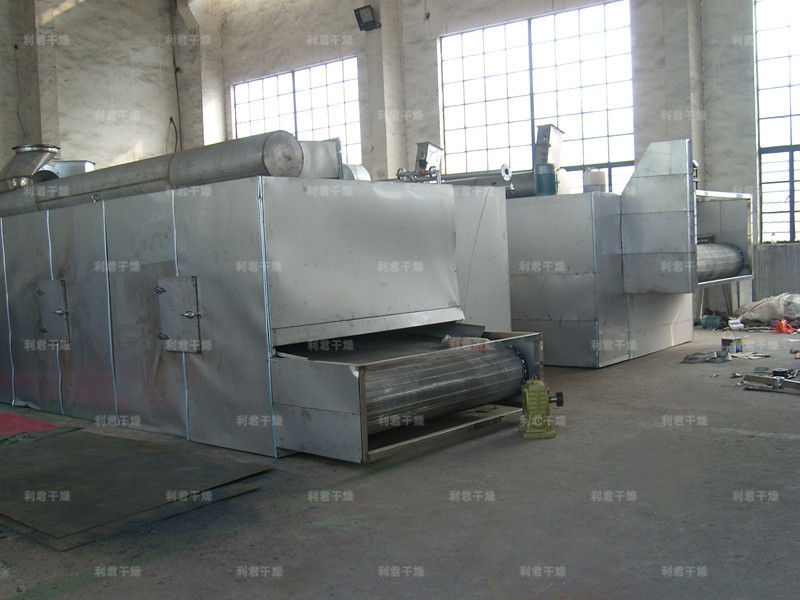 物料由加料器均勻地鋪在網(wǎng)帶上,網(wǎng)帶一般采用12-60目不銹鋼絲網(wǎng),由傳動(dòng)裝置拖動(dòng)在干燥機(jī)內(nèi)移動(dòng)。干燥機(jī)由若干單元組成,每一單元熱風(fēng)獨(dú)立循環(huán),部分尾氣由專門排濕風(fēng)機(jī)排出,廢氣由調(diào)節(jié)閥控制,熱氣由下往上或由上往下穿過鋪滿物料的網(wǎng)帶完成熱量與質(zhì)量傳遞的進(jìn)程,帶走物料水份。網(wǎng)帶緩慢移動(dòng),運(yùn)行速度可根據(jù)物料溫度自由調(diào)節(jié),干燥后的成品連續(xù)落入收料器中。上下循環(huán)單元根據(jù)用戶需要可靈活配備,單元數(shù)量亦可根據(jù)需要選取。