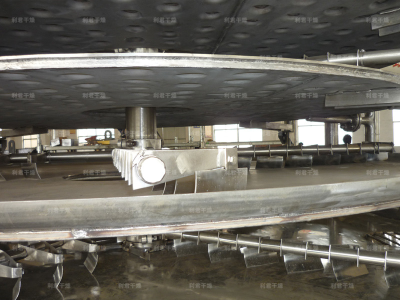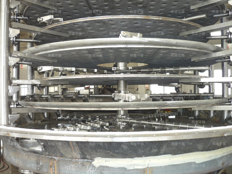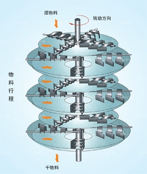 濕物料自加料器連續(xù)地加到干燥器上部第一層干燥盤上,帶有耙葉的耙臂作回轉運動使耙臂作回轉運動使耙葉連續(xù)地翻抄物料。物料沿指數(shù)螺旋線流過干燥盤表面,在小干燥盤上的物料被移送到外緣,并在外緣落到下方的大干燥盤外緣,在大干盤上物料向里移動并從中間落料口落如下一層小干燥盤中。大小干燥盤上下交替排列,物料得以連續(xù)地流過整個干燥器。中空的干燥盤內通入加熱介質,加熱介質形式有飽和蒸汽、熱水和導熱油,加熱介質由干燥盤的一端進入,從另一端導出。已干物料從最后一層干燥盤落到殼體的底層,最后被耙葉移送到出料口排出。濕份從物料中逸出,由設在頂蓋上的排濕口排出,真空型盤式干燥器的濕氣由設在頂蓋上的真空泵口排出。從底層排出的干物料可直接包裝。通過配加翅片加熱器、溶劑回收冷凝器、袋式除塵器、干料返混機構、引風機等輔機,可提高其干燥的生產能力,干燥膏糊狀和熱敏性物 料,可方便地回收溶劑,并能進行熱解和反應操作。