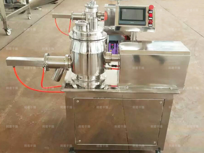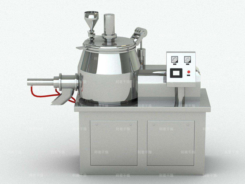 粉體物料與粘合劑在圓筒形容器中由底部混合漿充分混合成濕潤軟材,然后由側(cè)置的高速粉碎槳切割成均勻的濕顆粒。